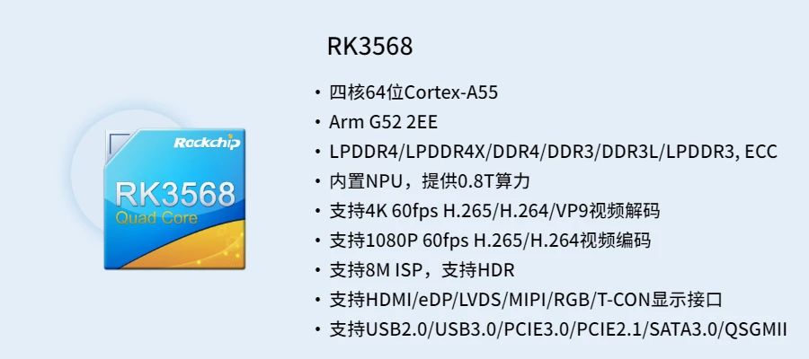 RK3568芯片是瑞芯微全新推出的新一代AIoT計算平臺,除具有高性能CPUGPU外,還搭載第三代AI處理器,有效滿足智慧視覺、工控、物聯(lián)網(wǎng)網(wǎng)關(guān)應(yīng)用的性能需求。其具備五大技術(shù)特性