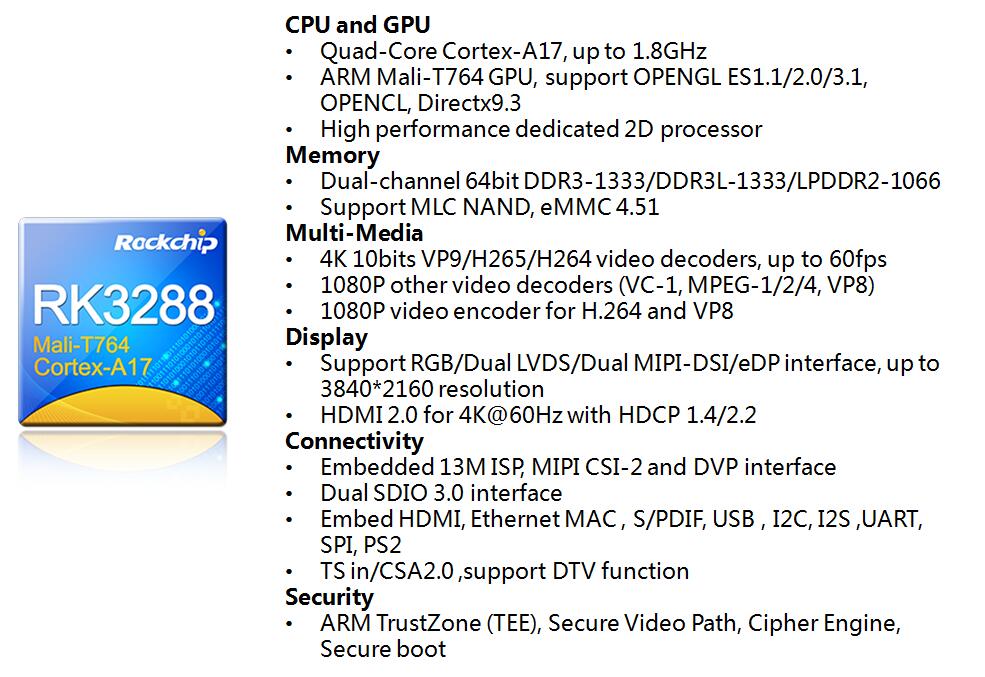 For Performance, RK3288 is based on 28nm HKMG process. The processor adopts Quad-core ARM Cortex-A17, up to1.8 GHz. DDR controller is dual-channel 64 bits DDR3 / DDR3L / LPDDR2 design. GPU adopts Mali - T7 series, up to 600 MHz. RK3288 is built into the 2D/3D graphics GPU acceleration processor, perfectly support OpenGL ES, OpenCL 1.1/2.0/3.1 DirectX9.3.In terms of the 3D effect, comparing with similar products, RK3288 has larger improvement. RK3288 also supports all mainstream video formats decoding, supports H. 265 and 4Kx2K resolution video decoding.
