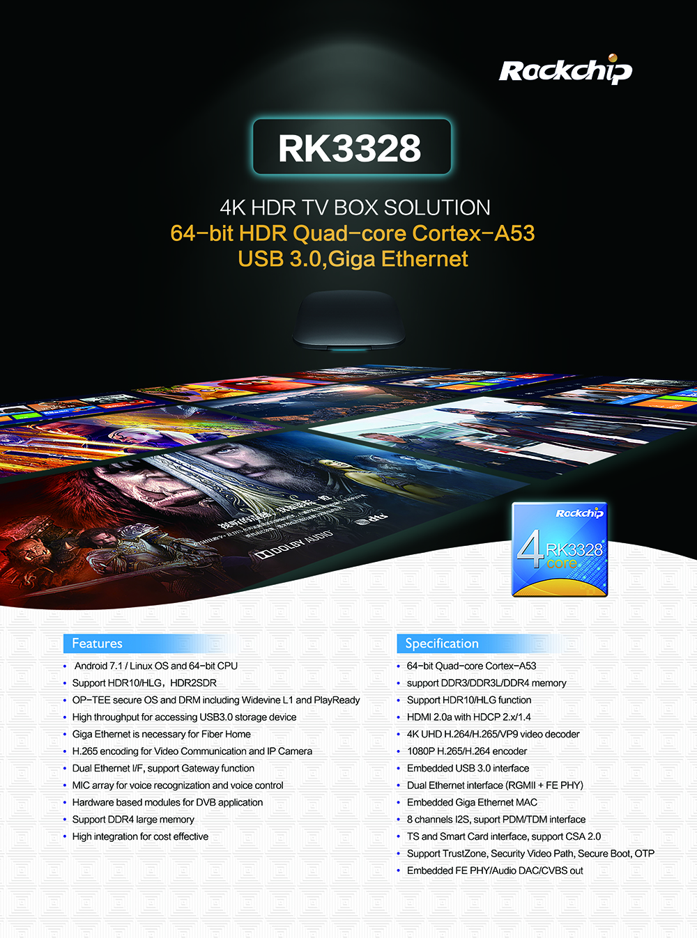 RK3328 UHD TV BOX solution features Quad-core 64-bit Cortex-A53 architecture, up to 1.5GHz, Mali-450 GPU. It supports Android 7.1 and Linux OS, 4K 60fps video decoding, HDR10/HLG and HDR2SDR, and meets the latest Ultra HD premium (UHD) standard.