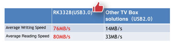On October 13, 2017, during the Hong Kong Electronics Fair (Autumn Edition), Rockchip showed its new upgraded RK3328 UHD TV BOX solution. Compared with previous generations and similar products in the market, it takes the lead in supporting USB3.0 interface and enhances the speed by almost three times.